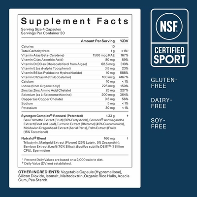 Synergen Complex® Renewal* (Patented): Saw Palmetto Extract (Fruit) (50% Fatty Acids), Sensoril® Ashwagandha Extract (Root and Leaf), Turmeric Extract (Rhizome) (45% Curcuminoids), Moldavian Dragonhead Extract (Aerial Parts), Palm Extract (Fruit) (15% Tocotrienol); Nutrafol® Blend: Tributyrin, Marigold Extract (Flower) (25% Lutein, 5% Zeaxanthin), Bamboo Extract (Leaf) (70% Silica), Bacillus subtilis DE111® (1 Billion CFU), Spermidine. Other Ingredients: Vegetable Capsule (Hypromellose), Silicon Dioxide, Isomalt, Maltodextrin, Organic Rice Hulls, Acacia Gum, Pea Starch.