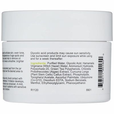 Purified Water, Glycolic Acid, Hamamelis Virginiana (Witch Hazel) Water, Ammonium Hydroxide, Polysorbate-20, Green Tea Polyphenols, Chlorella Protothecoides (Algae) Extract, Curcuma Longa (Plant Stem Cells) Callus Extract, Phospholipids, Tocopheryl Acetate, Ascorbyl Palmitate, Ubiquinone (Co-Q10), Disodium EDTA, Sodium Benzoate, Menthol, Ethylhexylglycerin, Phenoxyethanol.